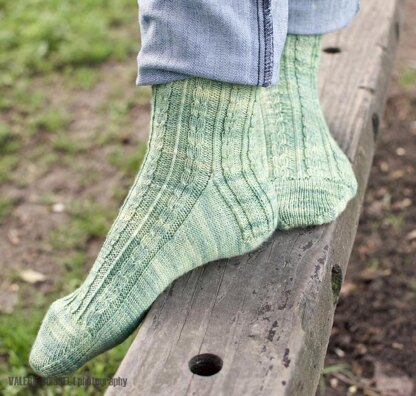 These socks have a very stretchy leg, allowing for several sizes to be worn, and are best showcased in a solid or semi-solid coloured yarn, which will help the cables to show off against the twisted stitches.