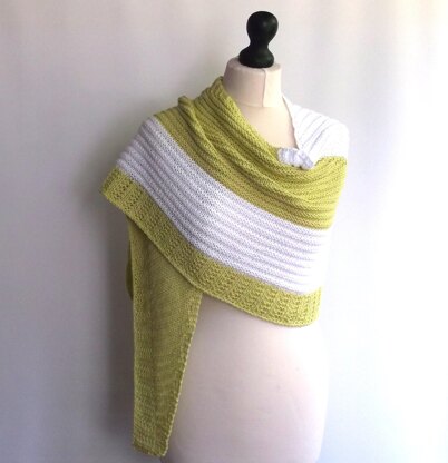 Firstly, a pattern of stocking stitch and reverse stocking stitch stripes are worked in a triangle shape. Then stitches are picked up down one side to work a panel away from the first piece. Finally, a garter rib border is worked to finish.