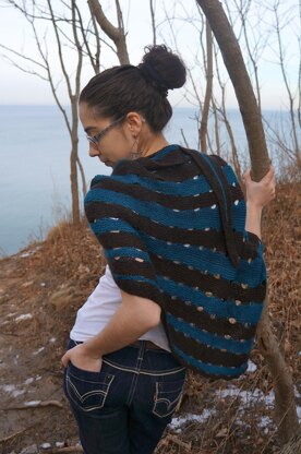 Ridge Lines is an asymmetrical triangle shawl/scarf shaped using short rows (no decreases). Blocking opens up the “button holes”to create a piece both airy and solid. The button-hole-type cutouts are formed by binding off and then casting on stitches during the following row. I used a backward loop cast on to avoid turning my work for each cast on segment, but you may decided to use a knit or cable cast on if preferred.