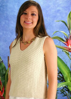 Knit up this flattering vest/top in a textured ridge stitch that is both interesting and easy to memorize. Front and back are knit separately from the bottom up, then seamed together. Armholes and vee neckline are edged by picking up stitches with a 16" circular needle and purling one round for a simple, but professional finish.