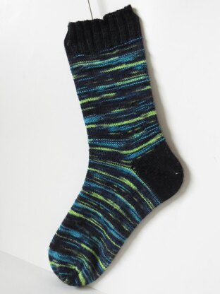 Materials: 1 Skein ONline Supersocke 4fach Neon Color Two, 75% Wool/25%Nylon; or other variegated sock yarn 400m and over. Sample knit with contrast heel and toe from West Yorkshire Spinners 4 ply. It is not necessary to have a contrast heel and toe with this pattern. (My husband likes tall socks, and I didn’t want to run out halfway through the design!)