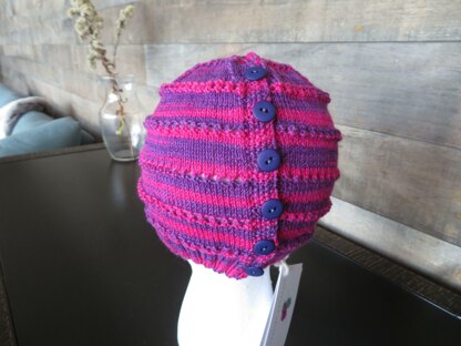 Just what you need when you want to wear a hat but your hair is in a ponytail. The integrated button band allows you to wear your ponytail high, low, or in between. Also works for a "messy bun" - just undo two buttons instead of one. Fingering yarn keeps the hat light, perfect for jogging.