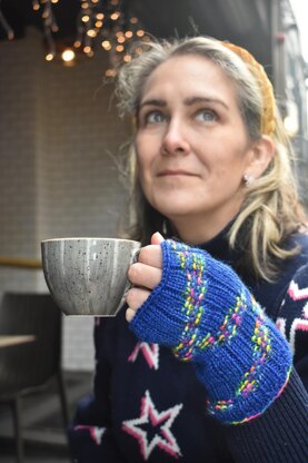 Rigel is the brightest star in the constellation of Orion. The star looks blue-white to the naked eye. These mitts are knit in the round then knit flat for the thumb hole then knit in the round again, creating a fun color shift. This also results in each mitt working for either hand and being wearable upside down equally well. The stitch pattern is my Colorway Accented Stockinette. Similar to the approach used for the Rigel Cowl, this pattern spotlights small bursts of color, making it ideal for colorways with a dominant color accented by a mini rainbow or speckles.
