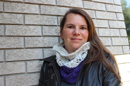The Rimfrost Cowl is a lacy cowl knit in aran weight yarn. The pattern is reminiscent of a frost formation, covering the cowl. The slight sparkle in the yarn adds to the look of glistening frost.