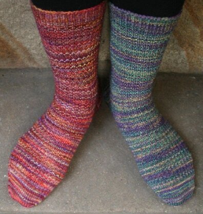 The Ringwood Sock pattern contains two separate patterns, one to knit the socks from the cuff down, the other to knit them from the toe up. They have a traditional gusset and slip stitch heel. These are designed for beginner sock knitters; a simple construction with a little pattern for interest and texture that works great in solid, semi-solid and variegated yarns. They are knit in one piece in the round on double pointed needles. Full instructions are provided for Kitchener stitching the toe together for the cuff down version and stretchy cast offs for the toe up version.