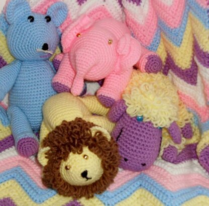 Full size crib blanket can be worked in any length. 4 matching toys-lion, sheep, mouse and elephant.