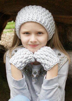 This textured set is perfect for a quick and inexpensive make. The half hat and mitts are constructed in the round.