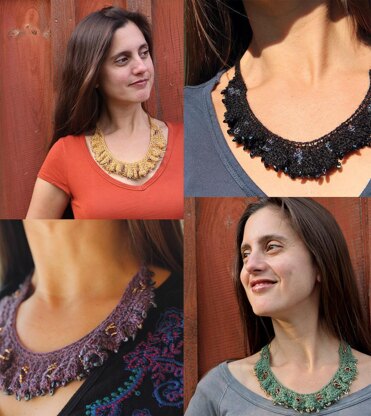 Rippled is a lightweight lace ruffle to adorn your neck. It is constructed by ten rows of garter stitch with beads placed at intervals for pools of shine. Finished off with a fringe bead bind off and i-cords for easily adjustable length. It's another necklace you can make in a night! (and yes, there are kits available)
