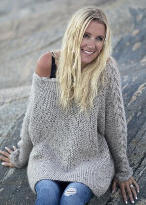 Inspired by the leaves in the forest, and the river that runs through it. This cozy sweater in soft wool is knitted in one piece, from cuff to cuff - sideways! The continuous double cable runs up the sleeve, and splits for shaping the neckline. A relaxed, but elegant and modern sweater with a loose fit. The garter stitches are created by simply knitting back and forth on the needle. Easy and fun to knit.