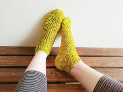 These ankle length socks are worked from the top (cuff) down. The mesh and cable pattern worked over the instep has both charted and written instructions.