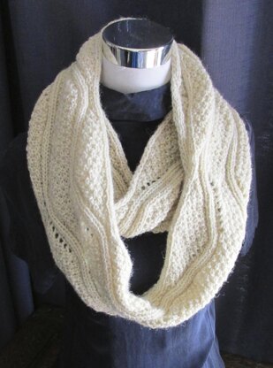 The cowl is made flat on 2 needles and joined into a loop using a 3-needle-cast-off. Written and charted pattern.
