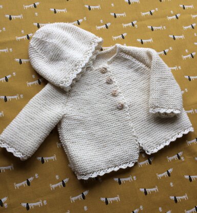 So easy to knit this simply,soft, and cosy little jacket and hat for those first few weeks, garter stitch with a little lace edging, giving it a nod to tradition without being overly fussy. Jacket will look lovely over a little dress, a pair of rompers, or an all-in-one for those very early days. The hat would be fine even for a boy you could skip the lace edge and go straight to the garter stitch. Warm and cosy enough to wear out in the pram.