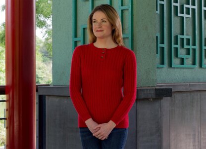 The Robin Jumper is an all-over cable jumper for women with set-in sleeves, waist shaping, and a neckline button band. It is knit from the bottom up, separated and worked flat after the armpits, then the sleeves are picked up around the armhole, shaped with short rows and worked down to the wrist.