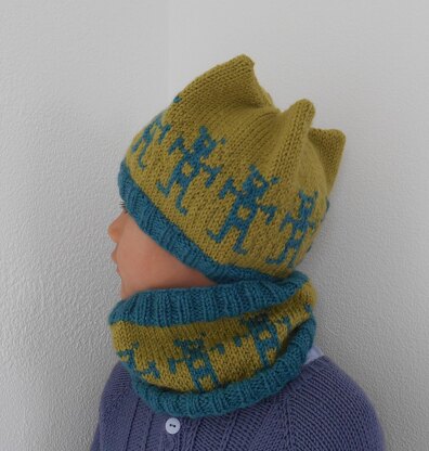 Robotique set offers you a set of matching cowl, hat and mitts to the Robotique sweater.
