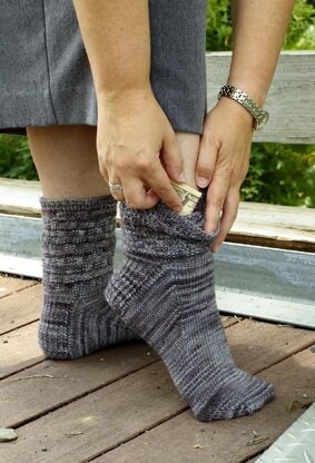 This socks starts out as a plain stockinette, cuff-down standard pattern. Once the sock itself is complete, stitches are picked up around the ankle and worked up in a cobblestone pattern to create a pocket around the leg. A secret pocket, good for stashing secrets. Or, you know, cab fare.