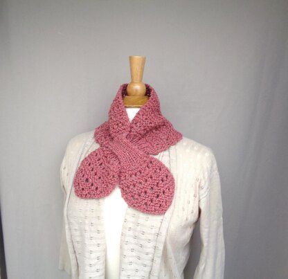 One end of the scarf pulls through a keyhole slit in the opposite end.