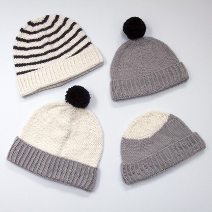 Four patterns in one. This classic beanie for babies and toddlers is endlessly customisable and this beginner's knitting pattern contains instructions for four different colour ways; stripes, classic, high contrast and colour block. Complete with a rib stitch roll up rim for keeping little ears warm and toasty.
