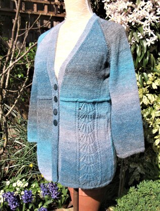 A stylish raglan cardigan with a shell stitch panel.