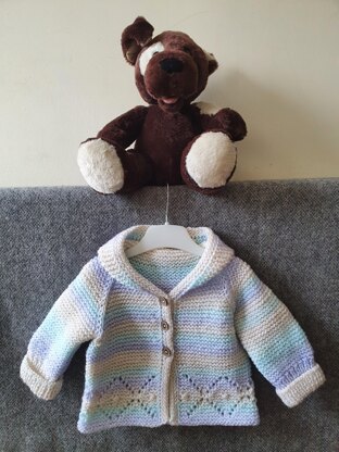 This cardigan is made for 6 - 9 months baby, the model is unisex and can be made in any colour. The measurements are: hood 20cm, sleeve 29cm, chest circumference 60cm, length 27cm.