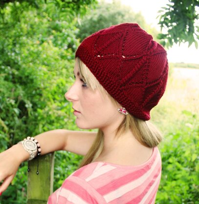 This beanie hat focuses on diamond lacing with a simple cable twisted running through. The crown continues the cable whilst drawing the diamonds in, creating a pointed edging. Not as complicated as it might look, creating an unusual hat ideal for a new project or a perfect gift.