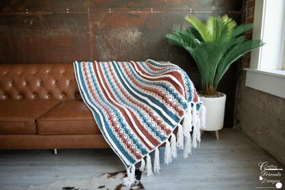 - 47"x70" supplies - Main Blanket: 790 yards Blue Heather, 1363 yards Snow White, 790 yards Terracotta Heather; Fringe:192 yards Snow White