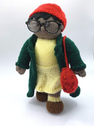 This pattern is based on the famous 1950s black and white image of her from the bus wearing a bucket hat, long coat and carrying a bag.
