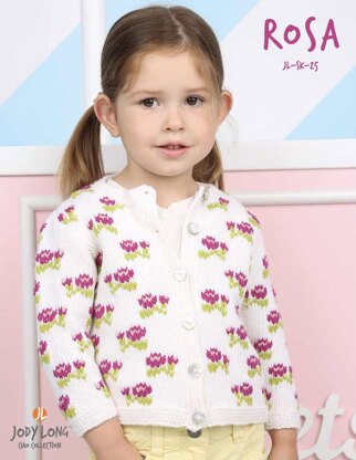 Rosa is an all over intarsia floral pattern which can be knitted in plain stocking stitch then using the duplicate stitch to work the flower details. The pattern comes in sizes 0-11 years and any standard DK weight yarn can be used.