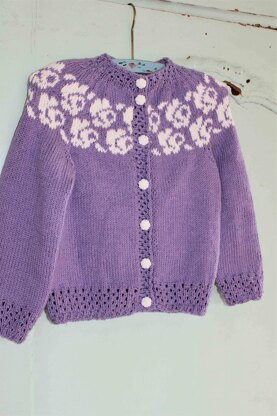 Rosalil cardigan is worked from the bottom edge and up with a 2-color pattern on the yoke. The cardigan has a combined round and raglan yoke and sleeve construction and nice lace rib edges. The pattern is made for at yarn with a gauge of 26 stitches per 10 centimeters (stockinette stitch) i.e. a yardage of approximate 150 meters per 50 grams.