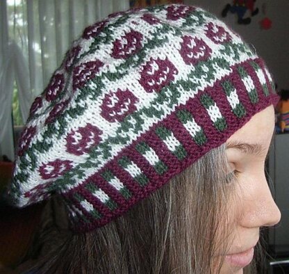 Some time ago I was searching the Ravelry patterns for a rose beret. It should have been a special kind: roses and leaves in rounds around a beret. As I couldn't find anything like this I had to make my own pattern. And I love all about it! It is knit in three colours, has a corrugated ribbing, bands of roses and their leaves around the body section and at the top is a beautiful single rose. And there are at most two colours in one row. I knit it three times and it's one of my easier patterns (the rose pattern is easy to remember).