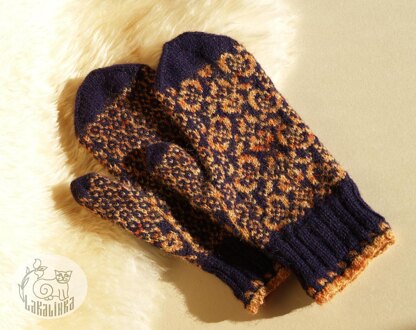 Design details: ● stranded colorwork mittens with ribbed cuff ● knitted in two colors ● worked in the round on DPNs ● with thumb gusset