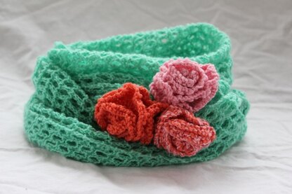 This scarf is knit with a lace weight or fine weight yarn on a #7 or 8 needle in a great openwork stitch pattern. It will keep you warm with the double wrap around or you can wear it long as an accessory necklace. The rose pattern is quick and simple and it is a great way to use up beautiful leftover colors.