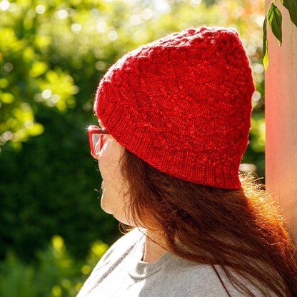 The Rose Jam Hat is a toasty, slouchy, worsted-weight hat with an all-over texture inspired by rose petals. The cabled petals, inspired by the heart-shaped petals of old fashioned roses, emerge from the crown of the hat and cascade down to the ribbed brim.