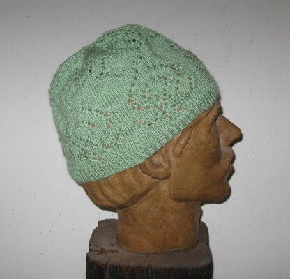 This is a simple lace hat with a rose design around the head and another flower design on the crown. The cap is worked in the round so there are no seams. There is a little "extra" fabric in the crown that lets you fold the hat easily. The sample measures about 18" (46cm) around and easily fits a 22" (56cm) head.