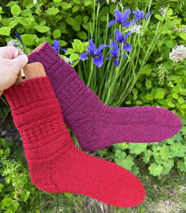 Socks are knit from the cuff down on double pointed needles, but circular needles can be used.