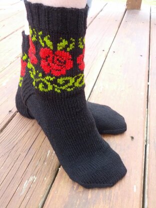 With spring almost here, my thoughts have turned to flowers. This sock utilizes stranded colorwork on the leg with one main color and two contrasting colors for leaf and rose motifs.