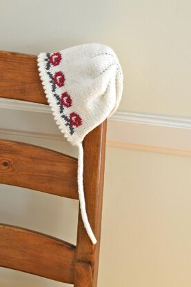This is a pretty little baby bonnet featuring a stranded rosebud design that is knit flat, a picot edging and wonderful I-cord ties. This is a pretty little baby bonnet works up very quickly in sport weight yarn.