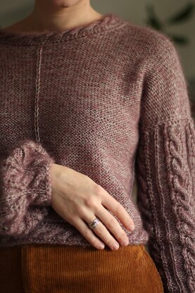 Rosematic is a romantic lightweight pullover, worked from the bottom up in a round and partially flat, with dropped puffy lace sleeves and attached cable edging around the scoop neck and hem. Perfect over dresses and/or high waisted skirt and pants. Designed cropped, but the length can be easily adjusted.