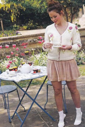 This is a pattern for Roses Cardigan, originally published in Knitting magazine. It is in stocking stitch with a rib edge, intarsia roses, raglan sleeves. The yarn has been discontinued, any yarn knitting to this dk tension can be used. Photos Laurel Guilfoyle for Knitting Magazine.