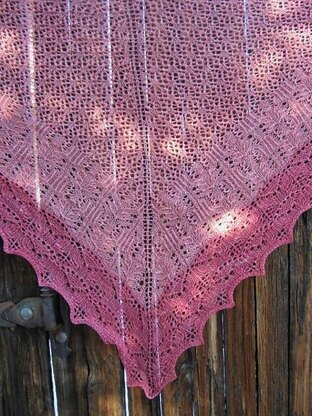 A triangular-shaped shawl knit from the top down, featuring 3 bands of rose-themed lace: A rosebud pattern, a climbing roses pattern, and a rosebush pattern for the final darker border.
