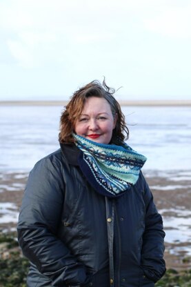 Rosetrees is an innovative and fun-to-knit, tubular cowl, knitted with a highly unusual 'bias' construction inspired by the Helen cowl from The Vintage Shetland Project. This creates stunning undulating colourwork motifs and an extremely cosy, double-layered fabric. Turning the cowl 'inside out' creates a completely different look, giving you two cowls for the price of one. Sitting high around the neck, its perfect for bracing walks along the beach or taking the dog for a walk on colder days. The clever use of a warming colour framing the face, reflects light and warmth and takes away any winter palor! The sample was knitted in Excelana DK, 100% British wool, using 6 complementary shades.