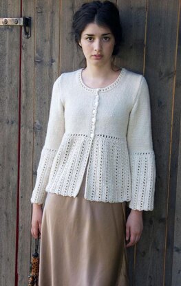 This feminine cardigan is worked sideways at the Bottom and bottom up on the Bodice and Upper Sleeves. The Bottoms are worked in Wool Classic for the Eyelet rows separated by 4 rows of St st in Silke. This could be worked solely in the Wool Classic but you will need one more hank of yarn.