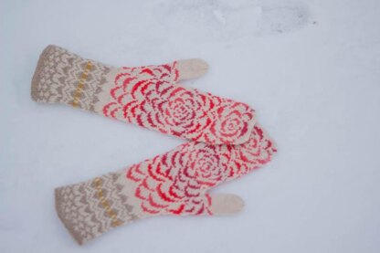 These mittens use 6 different colors of yarn: Two are the main colors: Oyster Heather (A, cream), and Coriander Heather (F, darker cream) Three reds are used in the Roses: Tomato (B, bright true red), Raspberry Heather (C, cool toned red), and Rosehip (D, coral toned red) One contrasting color is used: Turmeric (E, deep dirty yellow) One ball of each will be sufficient The mitts are fitted, with long cuffs. The thumb gusset is shaped, giving a right hand and a left hand. The cuff is turned under, and stitched down for a clean finish. They are knit from the bottom up. The pattern is charted.