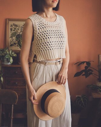 Rota Sleeveless Top is worked by knitting the back from top to the base of the armholes. Both fronts are picked up and knitted separately, some short rows are worked for shoulder shaping, then working from top to the edge of the front neck. After joining both pieces, front is worked to the armhole. Then front and back are joined and knitted in the round to the hem. Pick up stitches and knitting in the round for the armholes and neck ribbing.