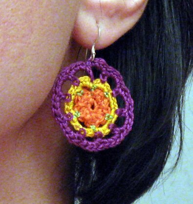 Got some left over embroidery thread? Then, grab a steel hook and make some fun-to-make and colorful crocheted earrings, with a center flower that really pops. Finished earrings are about 1 inch across and work up quickly. Would love to see your color combinations!