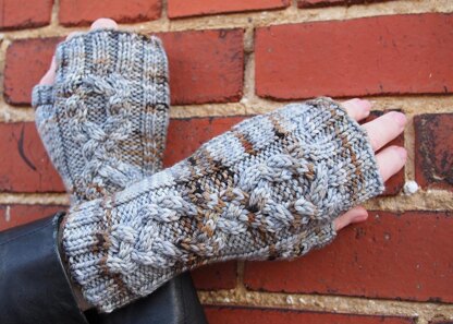Roundtop fingerless mitts feature an intricate braided cable and ribbed palm for a snug, warm fit.