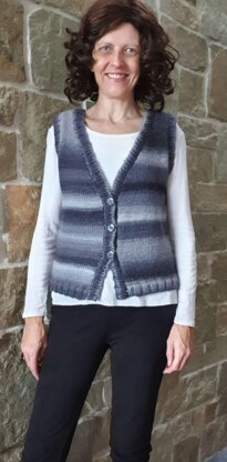 Lady’s stocking stitch vest with 2x2 rib bands, in two styles. Style A has a deep, round neck. Style B is a front opening, V neck style with three buttons.