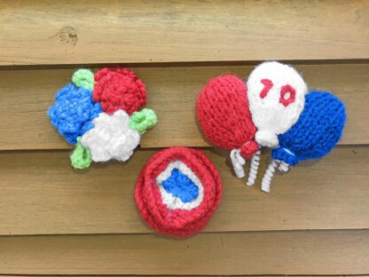 This listing is for a Jubilee badge / brooch knitting pattern of a rosette, balloons and flowers.