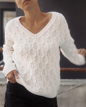 Royal is a V-neck pullover with drop shoulders, decorated with all-over aran print. I recommend choosing a size with 0-20cm /0-8” of positive ease depending on your personal preference.