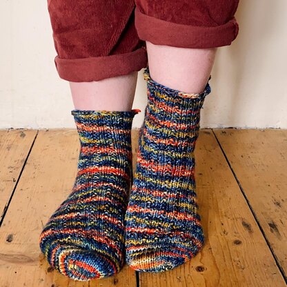 And they’re great fun to knit; with a fuss-free toe up construction, simple broken rib pattern, and fun German short row heel, they’re a great beginner’s sock pattern. The DK-weight yarn and 3.25mm needles make it easy to see what you’re up to, and means they knit up nice and quickly