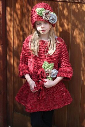 This beautiful sweater is knitted in separate parts and sewn together. The main portions of the pattern are knitted. Simple crochet is used to create a clean, finished look. The pattern is one size fits girls sizes 7-10. Instructions for knitting the hat are also included in this pattern. This pattern requires an U.S. Size 13 (9mm) knitting needles, a U.S. L-11 (8mm) crochet hook and any bulky yarn.